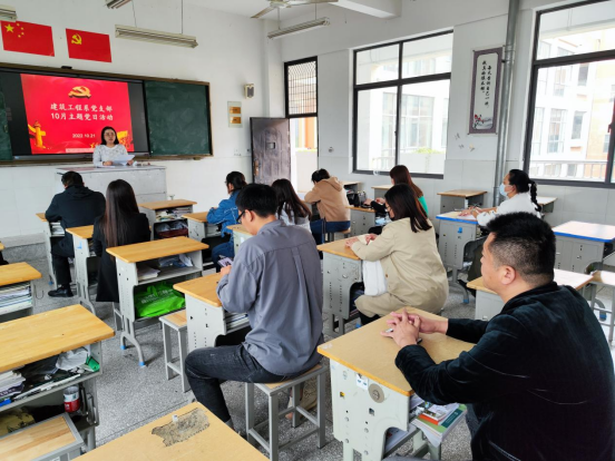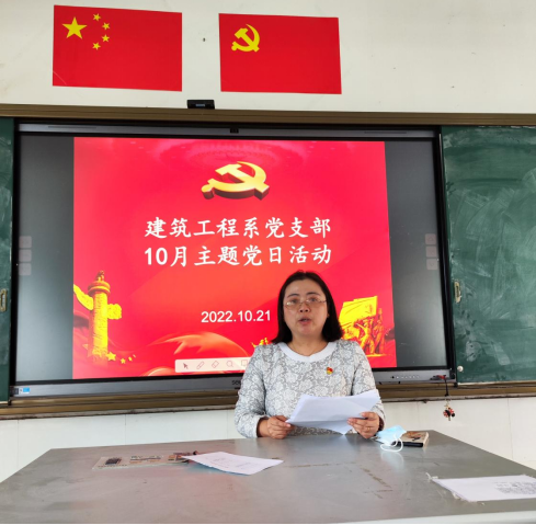 2022年10月21日下午建筑工程系党支部开展了10月份主题党日活动。会议由建筑工程系党支部书记单蕾同志主持,会议主要内容是学习宣传贯彻党的二十大精神。