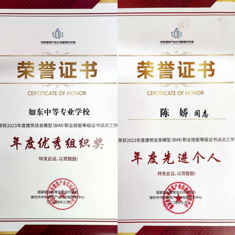 近日,国家“1+X”建筑信息模型(BIM)职业技能登记证书评价组织----中科建筑产业化创新研究中心公布了2023年全国优秀试点院校评选结果,我校喜获2023年度建筑信息模型(BIM)职业技能登记证书试点工作“年度优秀组织奖”。建筑工程系陈娇老师获得“先进个人”的称号。